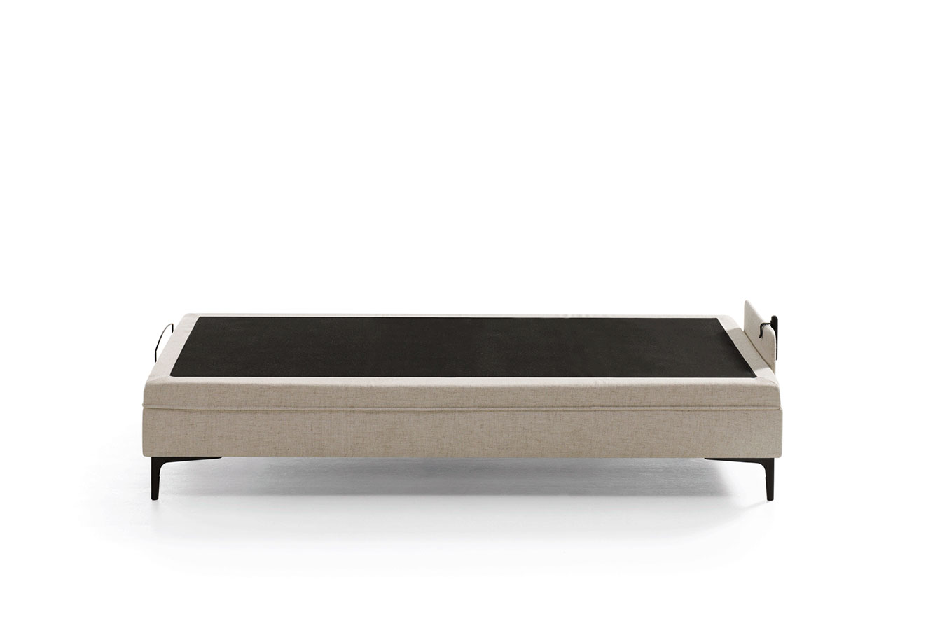 Reducimos la altura de la base para optar por una variedad mas amplia de patas de diferentes diseños y alturas. Mantiene además un diseño sencillo y atemporal, delimitado en este caso por un estilizado tapizado en al extremo inferior, y un arquillo metálico en el superior, que mantienen el colchón en su posición correcta.